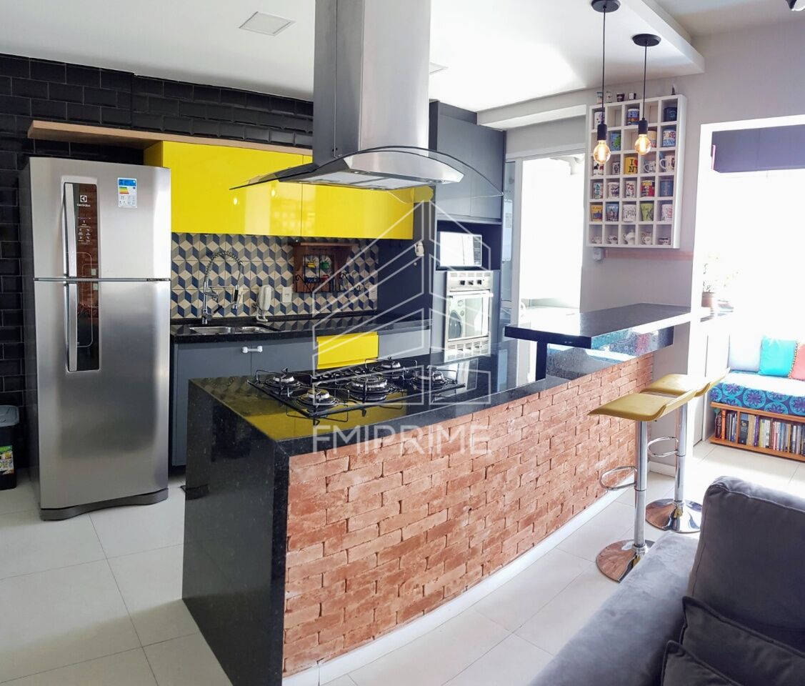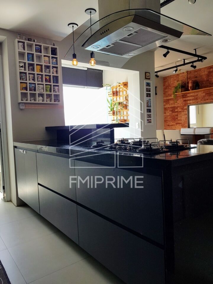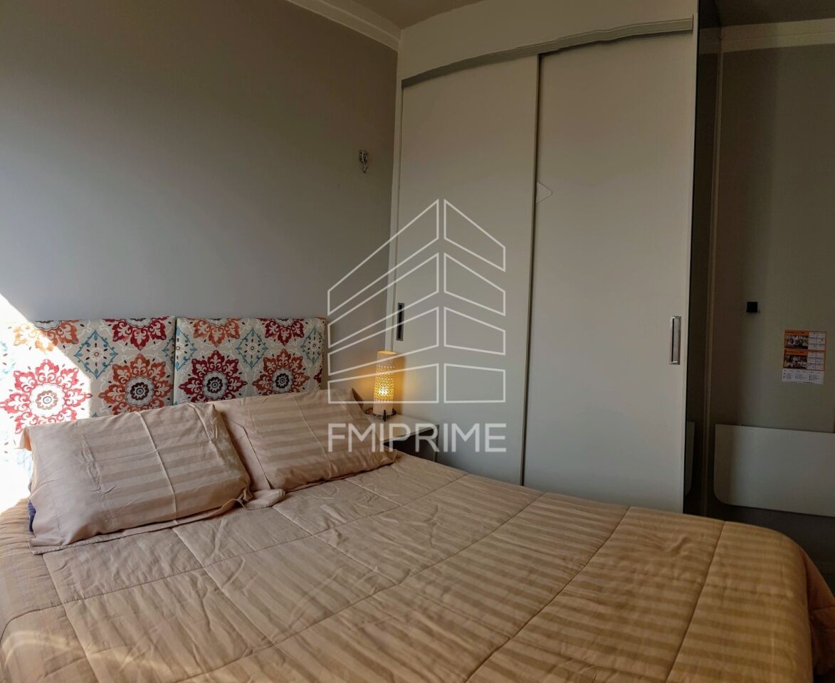 A suíte proporciona um refúgio privativo, enquanto a cozinha americana, repleta de armários planejados, atende aos padrões mais exigentes.