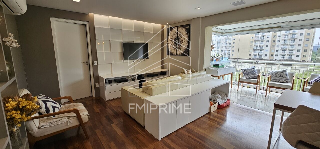 Varanda gourmet integrada à sala, fechada com vidro e totalmente decorada