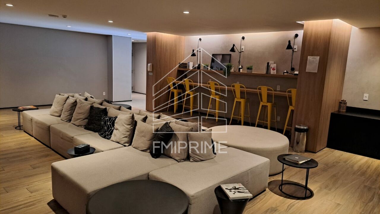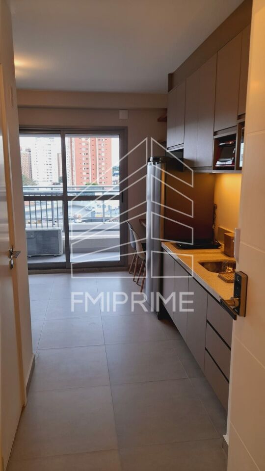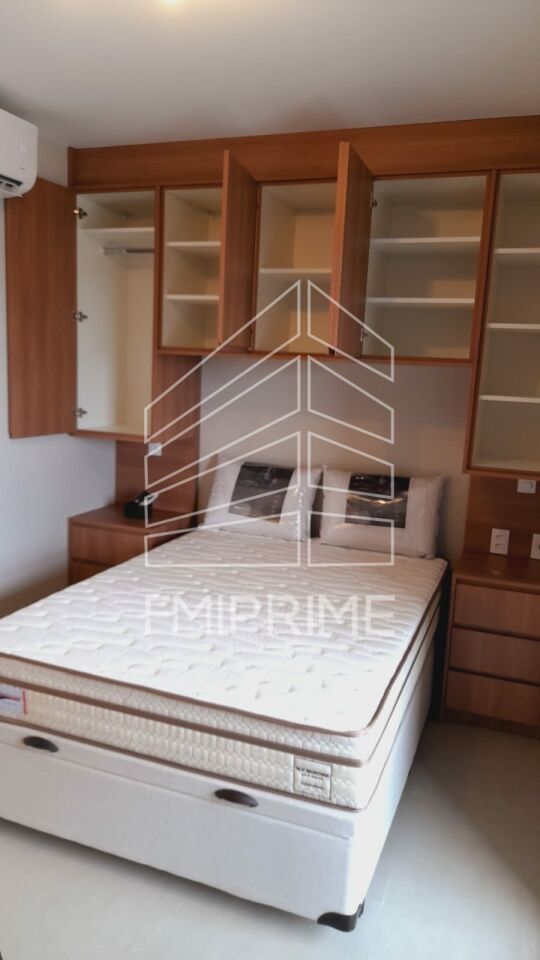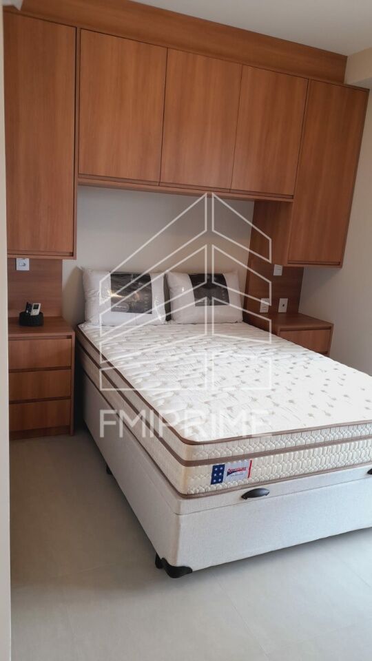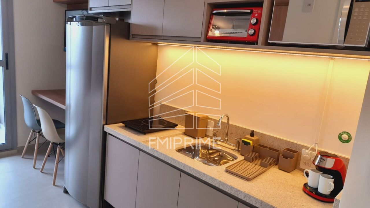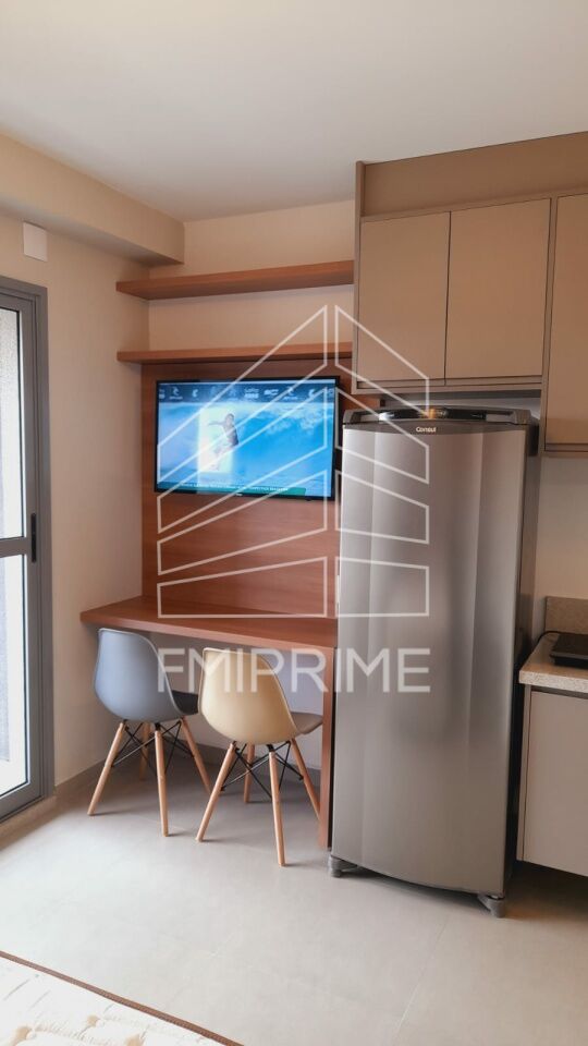 Studio completo com móveis planejados de ótima qualidade, com cozinha, banheiro, quarto, ar condicionado, TV, fogão, forno, microondas e geladeira.