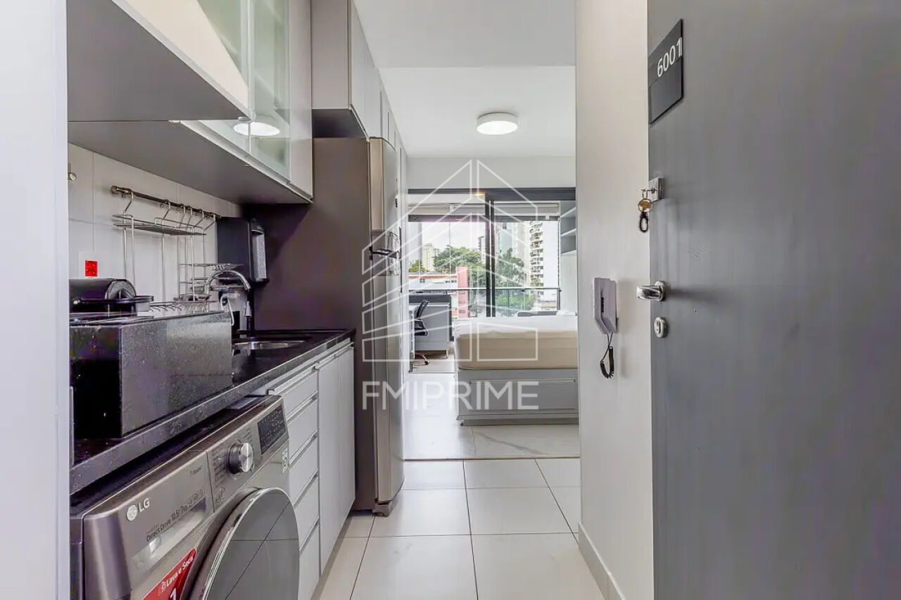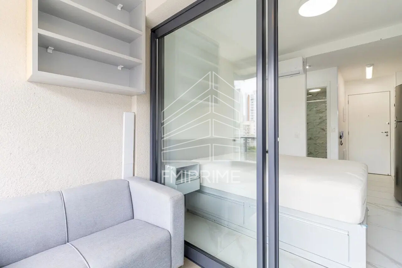 O estúdio está completamente mobiliado com itens de qualidade e tudo que você pode precisar. Estamos falando de uma cama queen size com compartimentos para armazenamento abaixo e quatro gavetas laterais (duas de cada lado), garantindo otimização de espaço. Conta ainda com ar-condicionado, geladeira de duas portas, smart TV com suporte articulado para diferentes posicionamentos, máquina lava e seca, cooktop, máquina de café expresso, tábua de passar retrátil, cofre estrategicamente posicionado atrás da TV e armários planejados com portas de vidro esfumaçado na cozinha. A varanda é envidraçada e equipada com escrivaninha, sofá e armário com prateleiras, criando um ambiente versátil para trabalho ou relaxamento. Além disso, conta com um varal articulado que se esconde na parede da varanda, otimizando o espaço ao máximo.