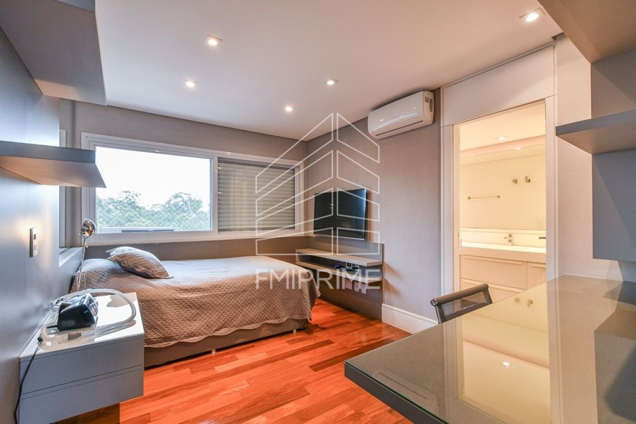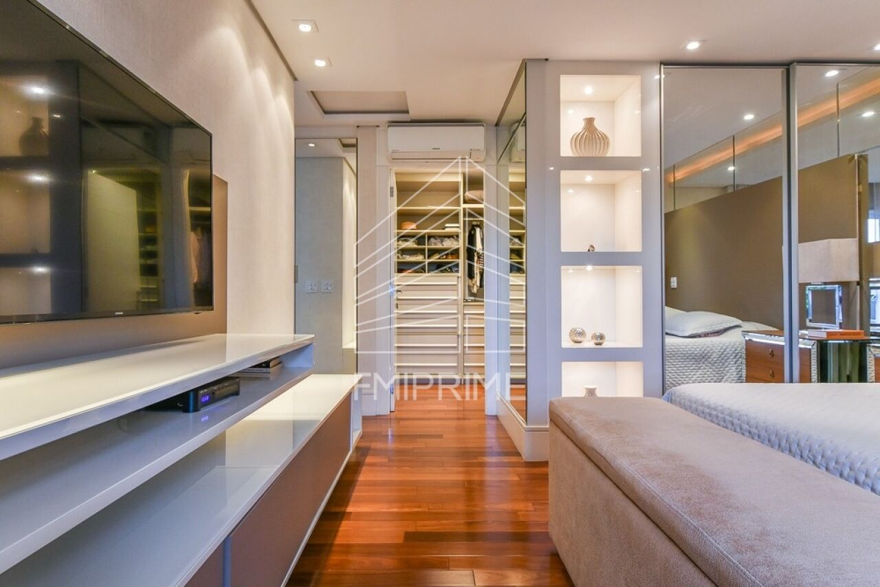 A planta original contempla quatro suítes. No layout atual, uma delas foi integrada ao living, ampliando a área social. Das três suítes existentes, duas foram unificadas para formar a suíte master do casal, com amplo closet e banheiros Sr. e Sra., proporcionando conforto e privacidade. Essa configuração pode ser facilmente revertida à planta original.