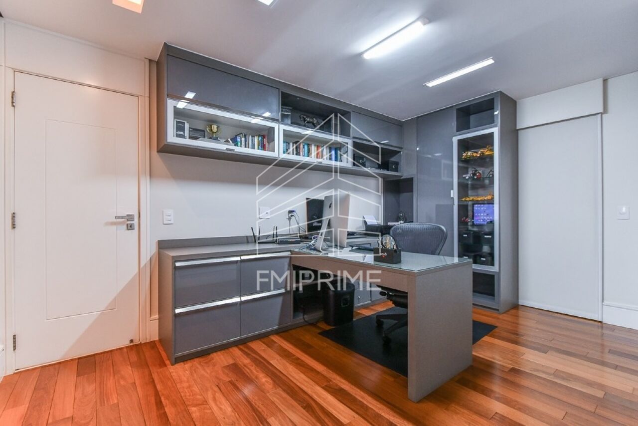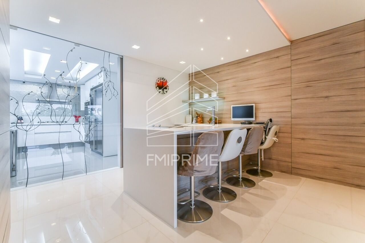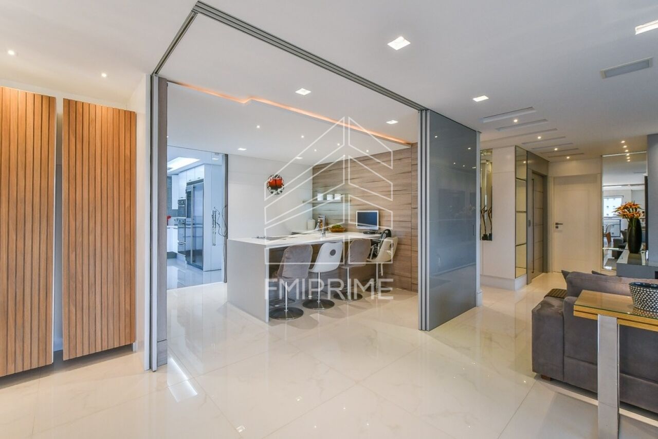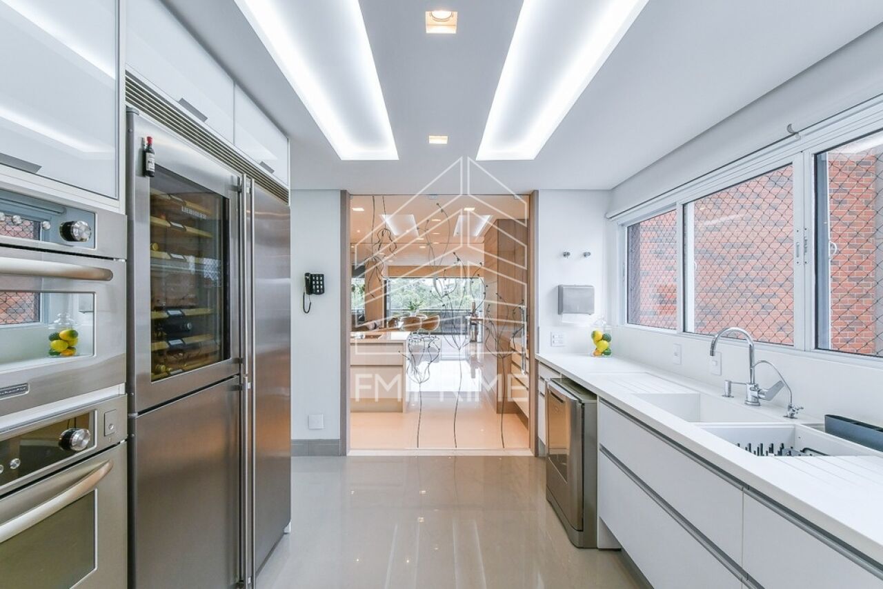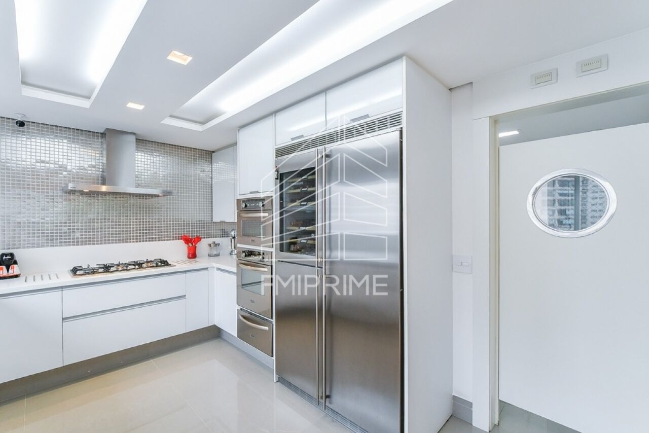 O apartamento conta ainda com escritório, lavabo e uma cozinha gourmet moderna, totalmente equipada, integrada à sala de jantar por portas de correr Cinex. Todas as bancadas são em Corian, reforçando o alto padrão de acabamento. O imóvel dispõe também de rouparia, lavanderia, despensa, dependência de funcionário com banheiro, além de três vagas de garagem e depósito privativo.