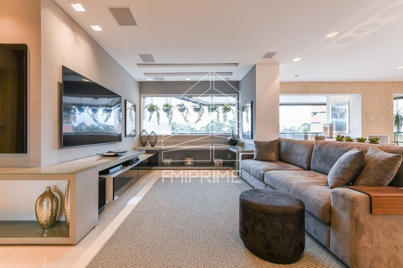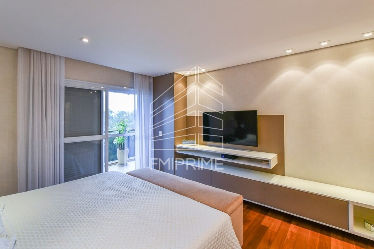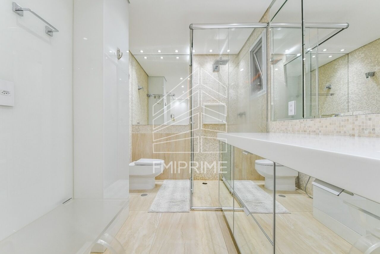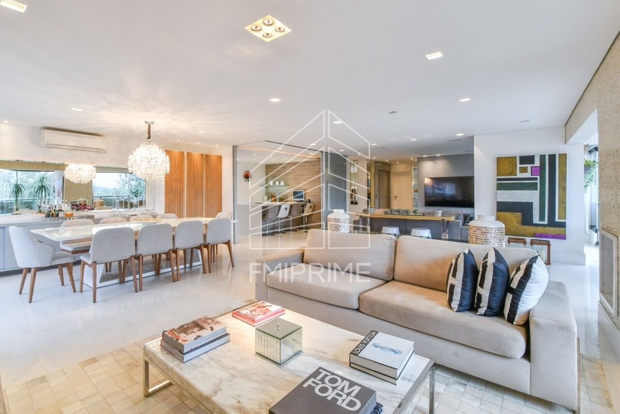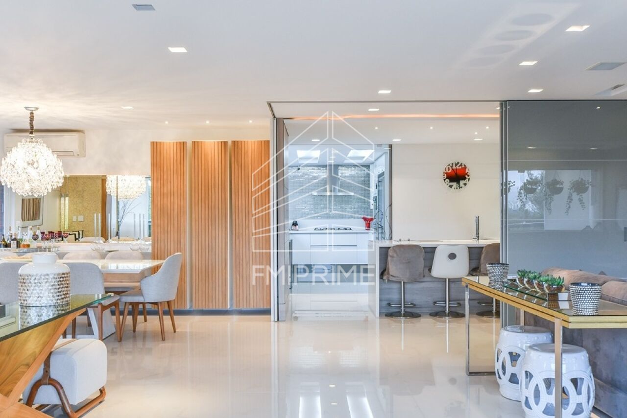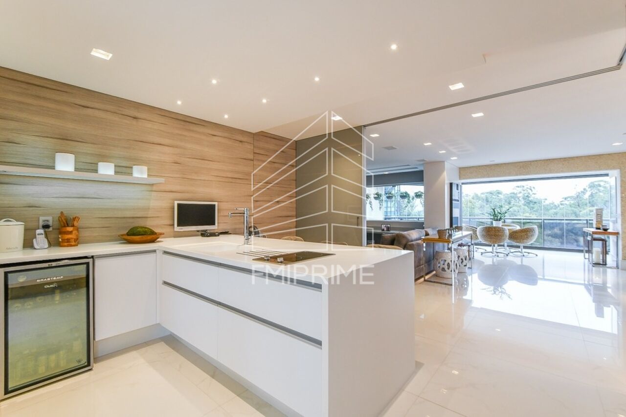 O apartamento conta ainda com escritório, lavabo e uma cozinha gourmet moderna, totalmente equipada, integrada à sala de jantar por portas de correr Cinex. Todas as bancadas são em Corian, reforçando o alto padrão de acabamento. O imóvel dispõe também de rouparia, lavanderia, despensa, dependência de funcionário com banheiro, além de três vagas de garagem e depósito privativo.