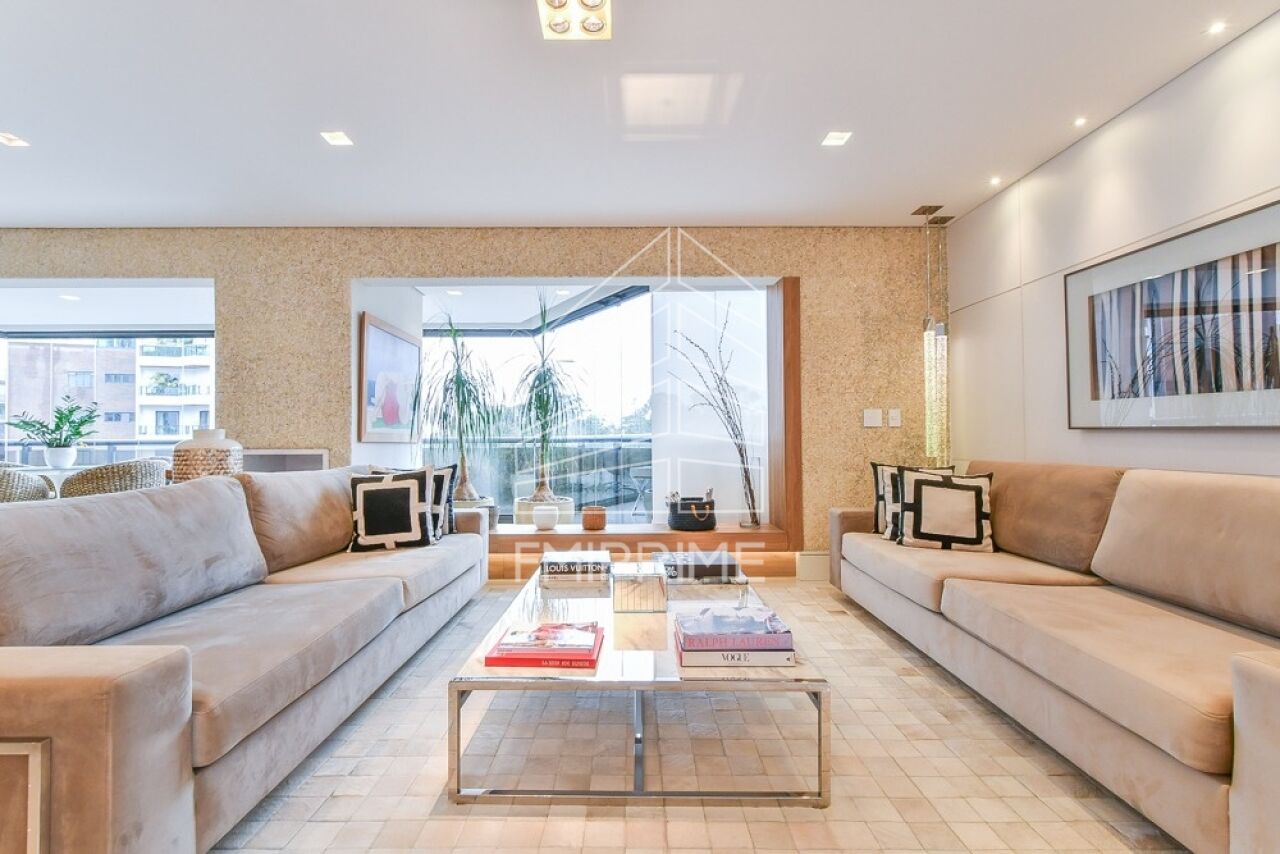 A área social se destaca pelo living amplo, integrado à varanda e com vista permanente para a Praça de Milão, a poucos passos do Parque Ibirapuera. A abundante entrada de luz natural valoriza os espaços e cria uma atmosfera acolhedora e elegante.