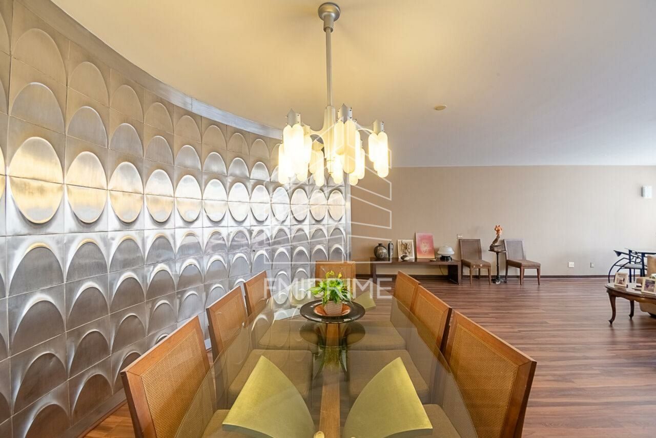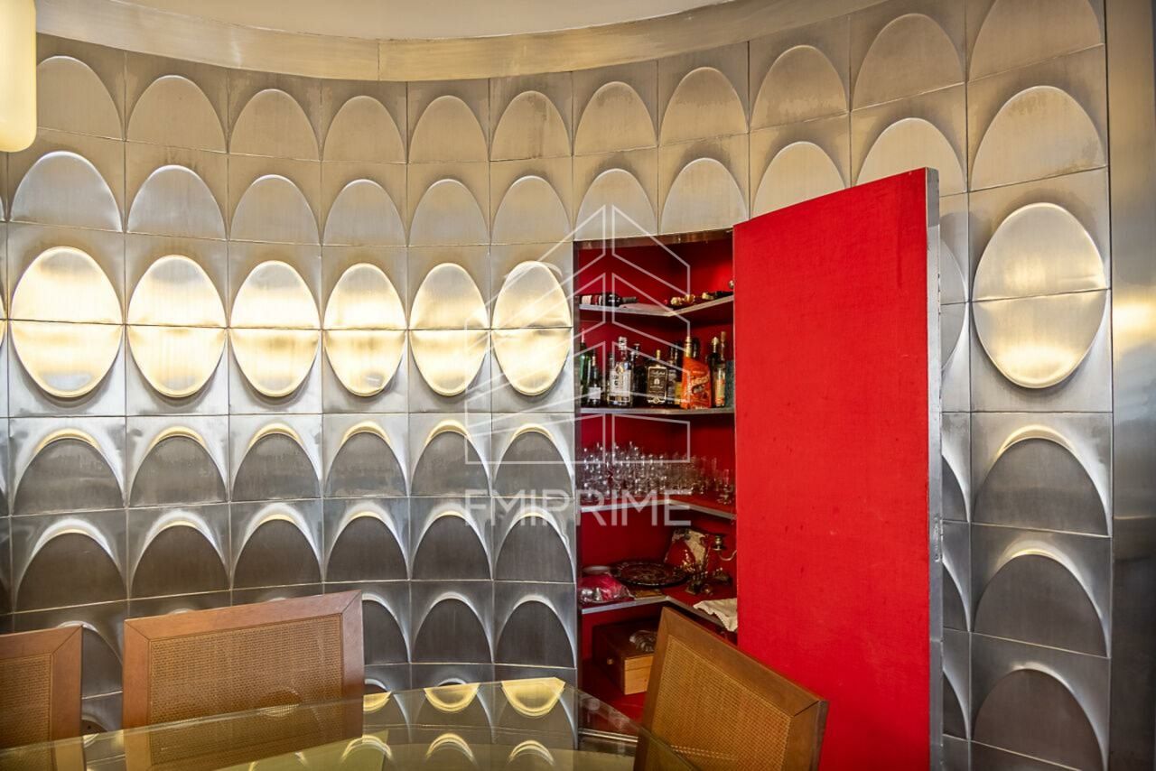 O living, com 70 m² e cinco amplas janelas voltadas para a rua ? característica rara nos Jardins ? comporta até quatro ambientes integrados com conforto e fluidez. A entrada é marcada por um hall elegante, valorizado por uma tapeçaria que dialoga com o painel oval em alumínio com ornamentos losangulares, elemento arquitetônico que oculta de forma sofisticada as portas de acesso ao bar, ao lavabo e à sala de almoço, conectando-se de maneira orgânica à cozinha e à área de serviço.