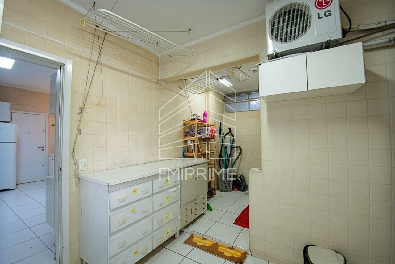 Na ala íntima, a circulação bem resolvida conduz a três dormitórios, sendo uma suíte com closet e ar-condicionado. Dois amplos dormitórios posicionam-se à esquerda do corredor, enquanto a suíte principal, à direita, destaca-se pelo closet generoso e pelo banheiro com dimensões de sala de banho. A cozinha recebe iluminação natural abundante, dispõe de extensa marcenaria, duas pias e espaço para duas geladeiras. A área de serviço é ventilada e completa, com quarto e banheiro para funcionários.