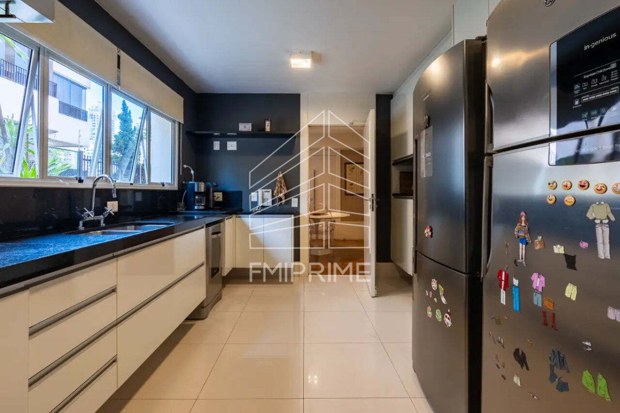 A área de serviço do apartamento é igualmente bem resolvida, com copa, cozinha e lavanderia perfeitamente setorizadas. A copa, charmosa e funcional, conta com porta de abrir que pode permanecer totalmente aberta, criando uma conexão harmoniosa com a sala de jantar, ideal para momentos de receber a família e os amigos com conforto e sofisticação. O imóvel ainda oferece dois dormitórios e um banheiro de serviço, além de cinco vagas de garagem, agregando comodidade e exclusividade ao conjunto.