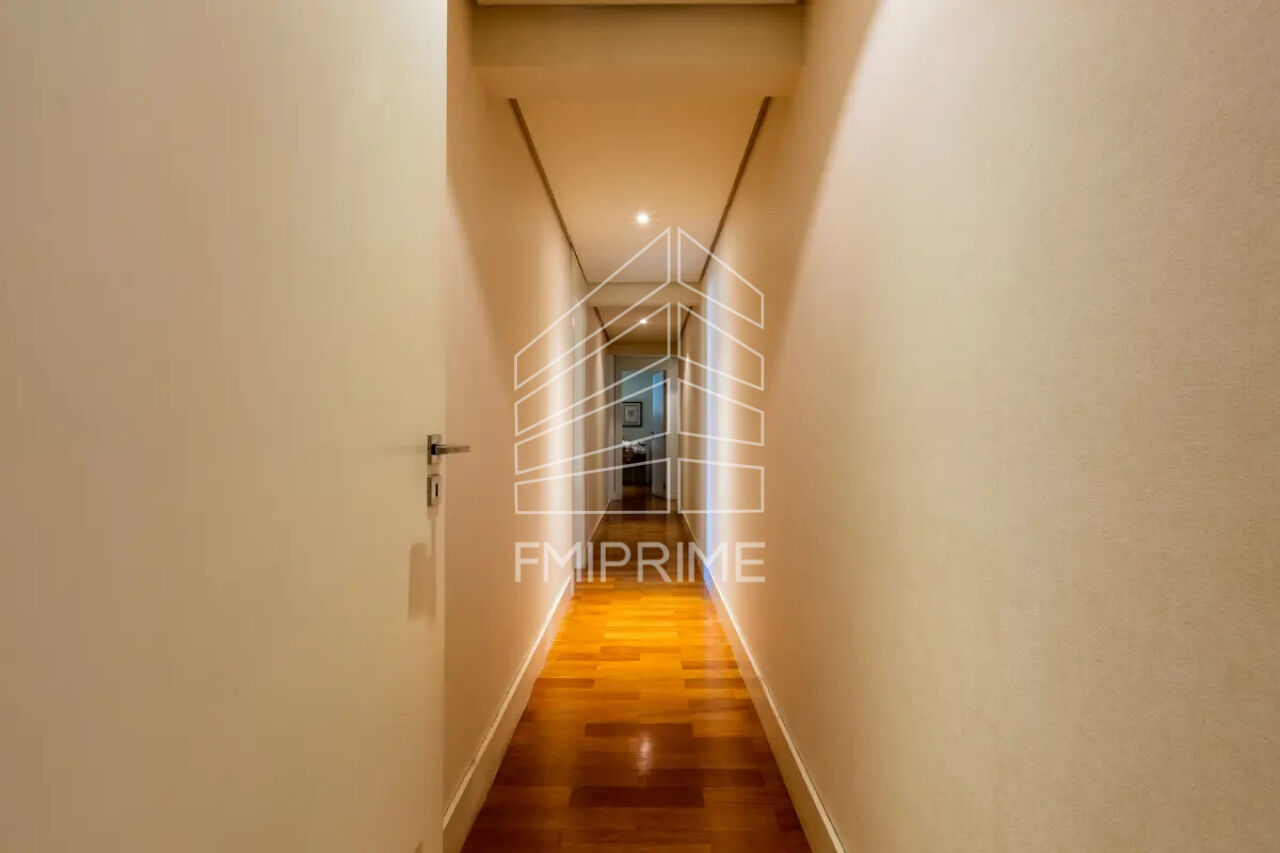 A entrada já anuncia o tom de exclusividade: um hall refinado onde se destaca uma imponente peça de madeira entalhada à mão, que remete à tradição artesanal e confere um toque de história ao espaço. A amplitude dos ambientes sociais impressiona. A sala de estar e jantar, iluminada por grandes janelas, abriga um home theater moderno com painel de mármore, compondo um cenário elegante que harmoniza design contemporâneo e materiais nobres.