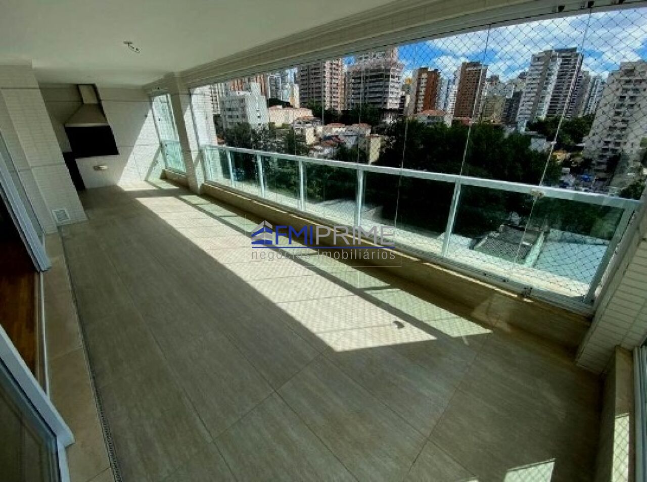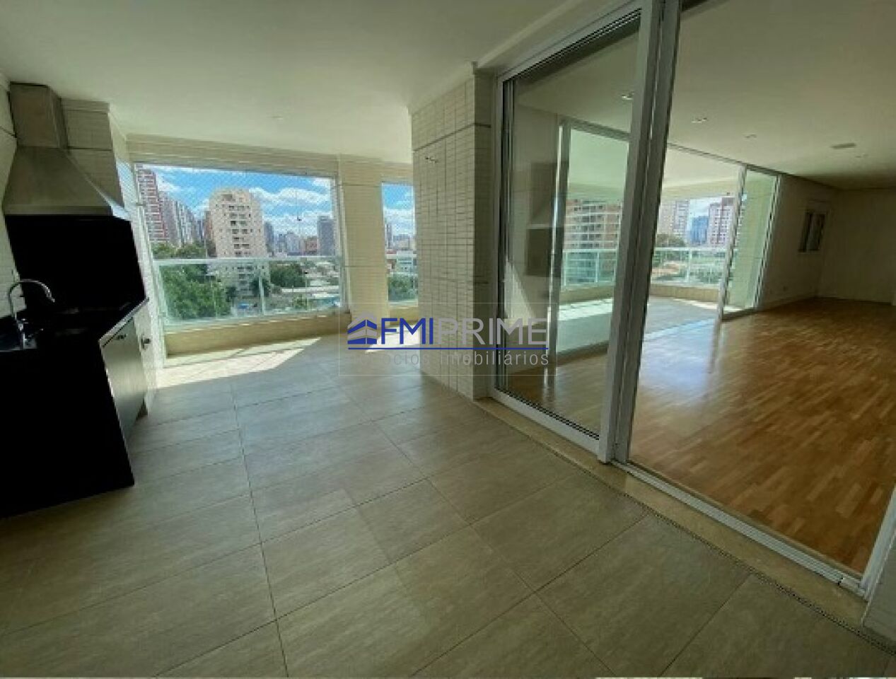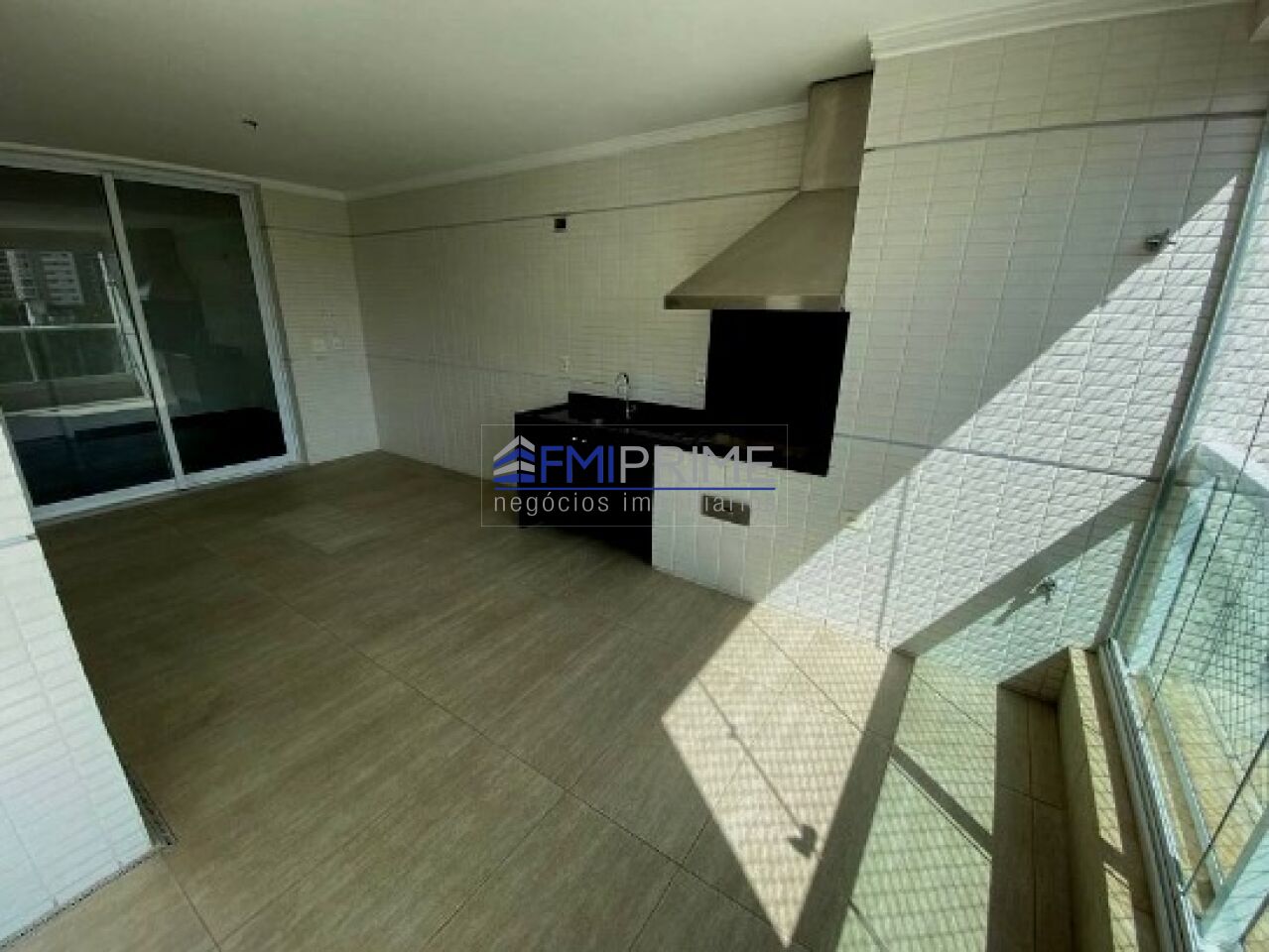 Varanda gourmet com três ambientes, equipada com churrasqueira, pia de apoio, bancada para 3 cadeiras e fechamento em vidro.