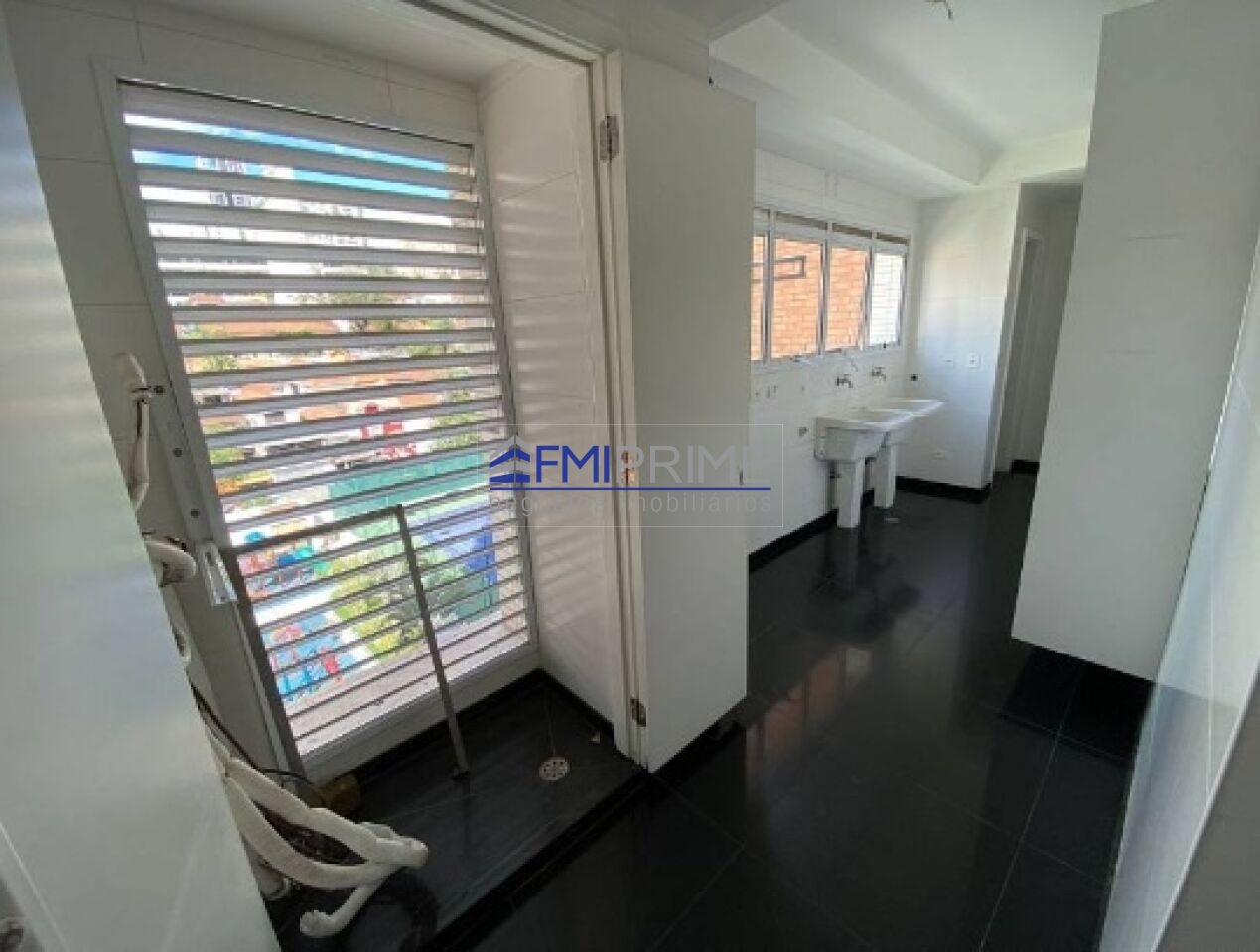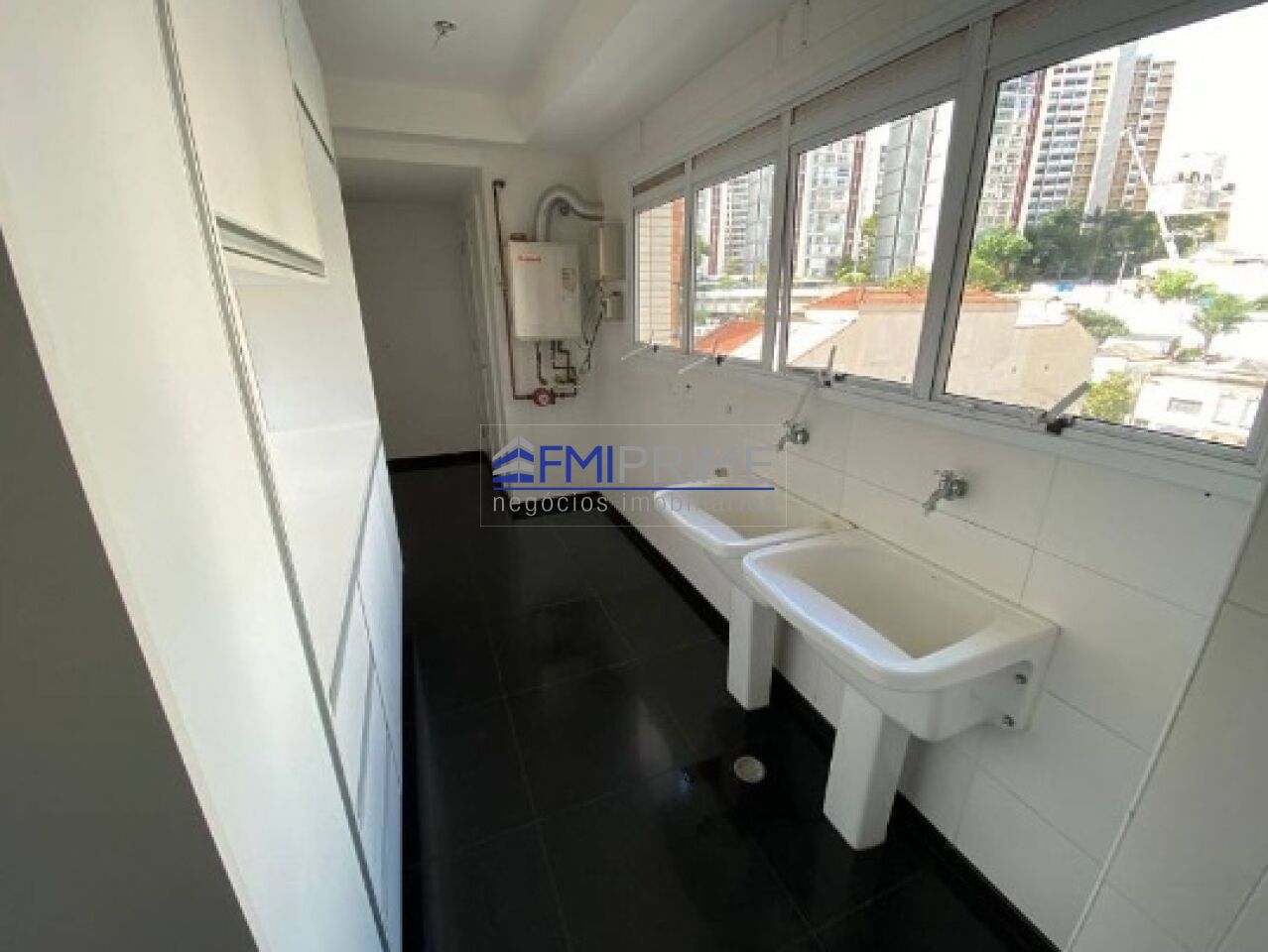Área de serviço com dormitório e banheiro de funcionário, casa de máquinas e aquecedor de água à gás Rinnai.