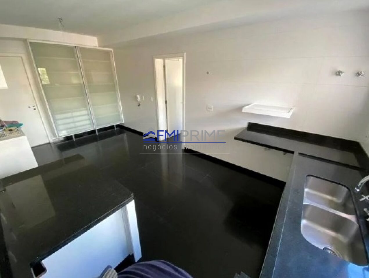 Cozinha com sala de jantar, armários planejados, pia com duas cubas e dispensa para mantimentos.