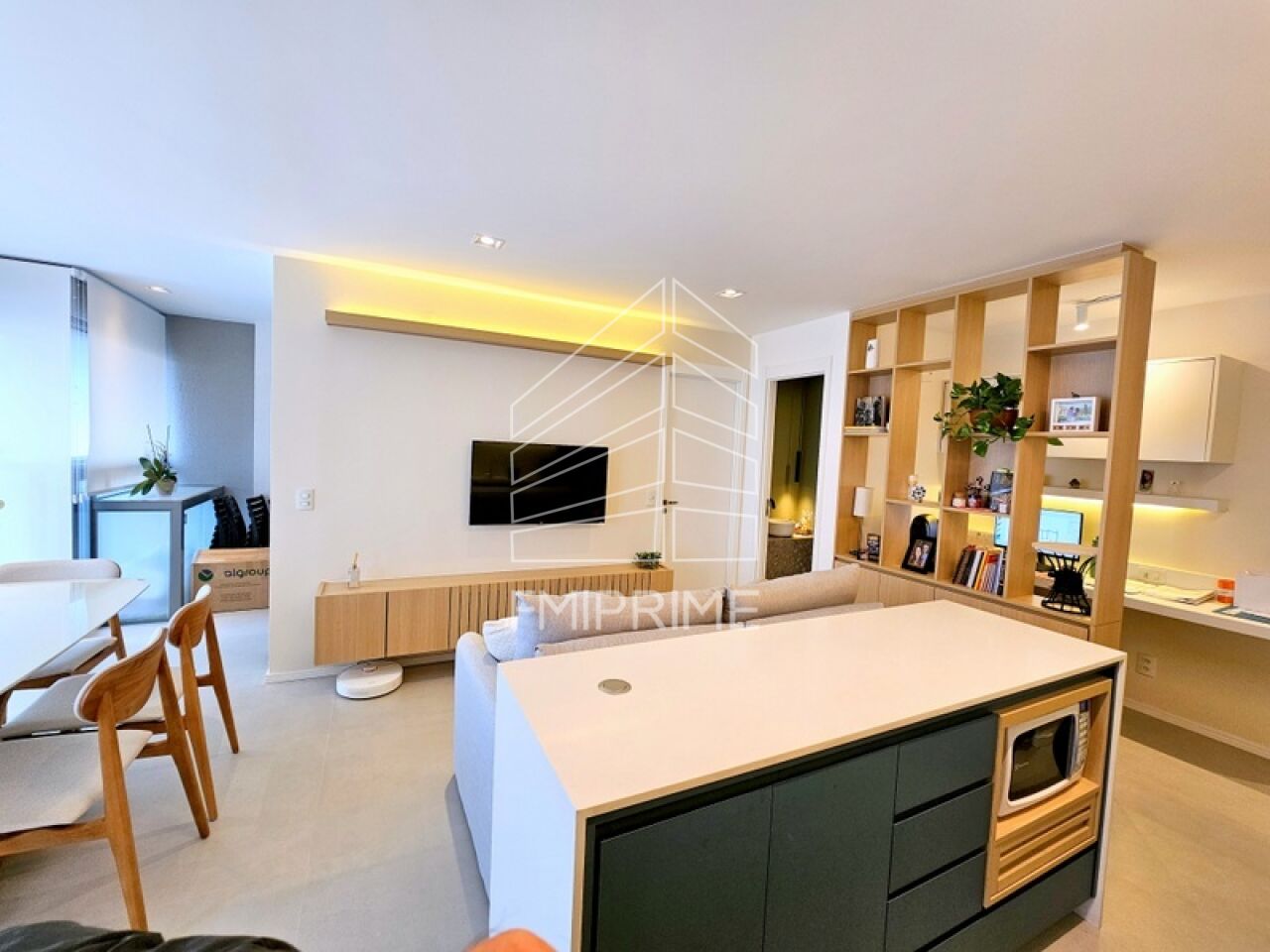 Living para 2 bons ambientes com destaque a presença de uma varanda integrada, perfeita para desfrutar de momentos, seja tomando um café da manhã tranquilo ou relaxando ao final do dia.