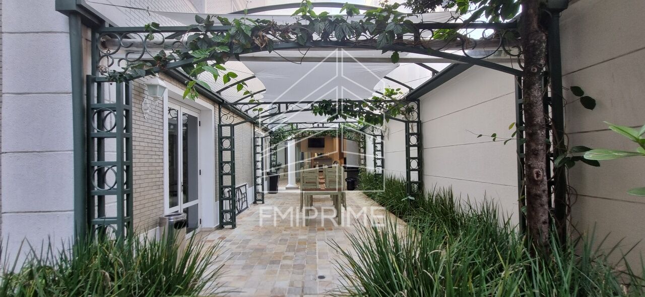 A área externa de lazer reúne um espaço gourmet coberto com bancada com pia dupla, churrasqueira embutida, forno de pizza e um corredor social ao ar livre sob pergolado translúcido, piso em pedras naturais, canteiros verdes e mobiliário versátil