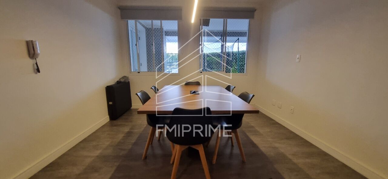 Espaço de coworking completo com sala de reuniões equipada com mesa ampla para 8 pessoas e iluminação natural, além de área de trabalho individual com móveis planejados em madeira, estantes, cadeira ergonômica e TV para apresentações e videochamadas.