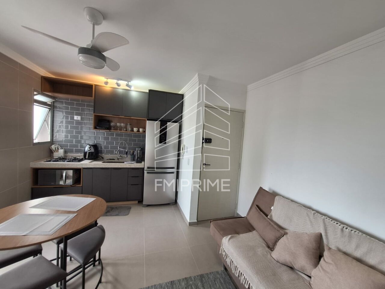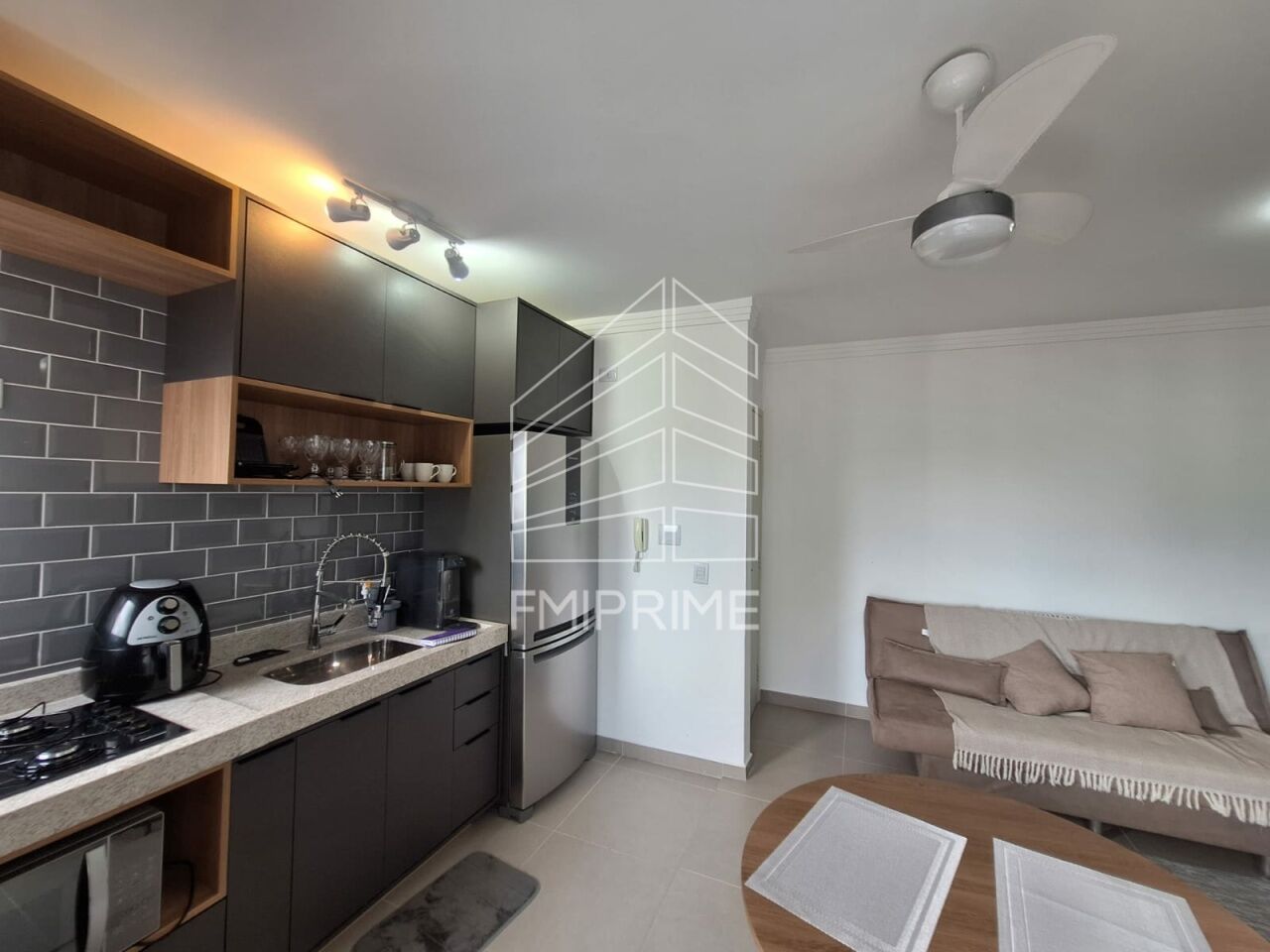 Cozinha americana, geladeira, fogão, louças, panelas etc.