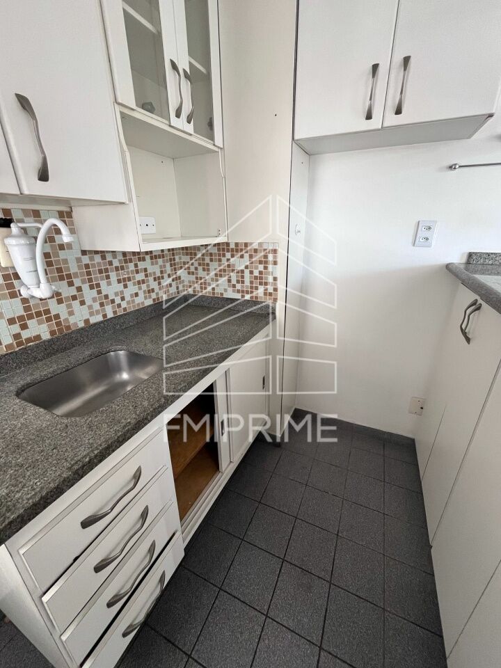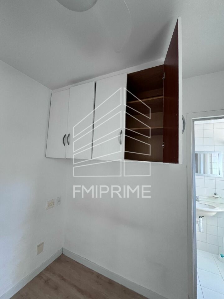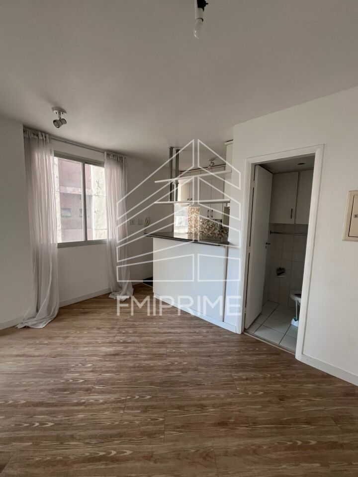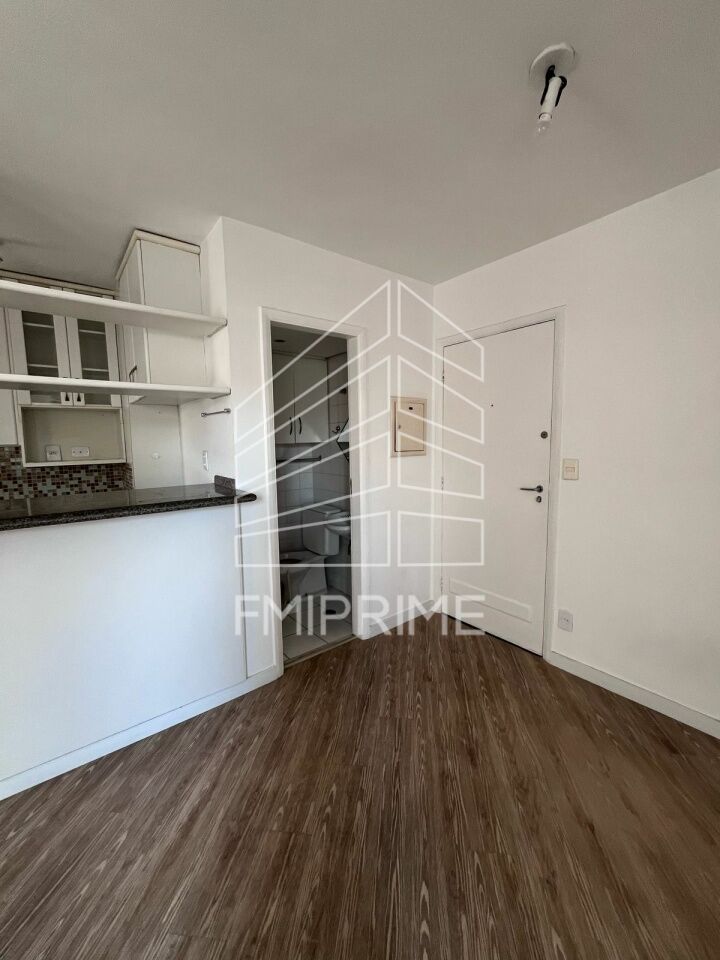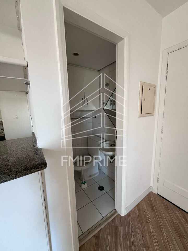 Apartamento de um quarto sendo suíte com armários, cozinha americana, lavabo, lavanderia, churrasqueira e áreas comuns.