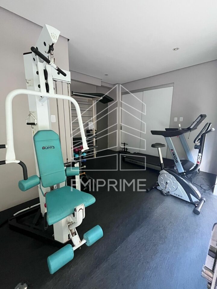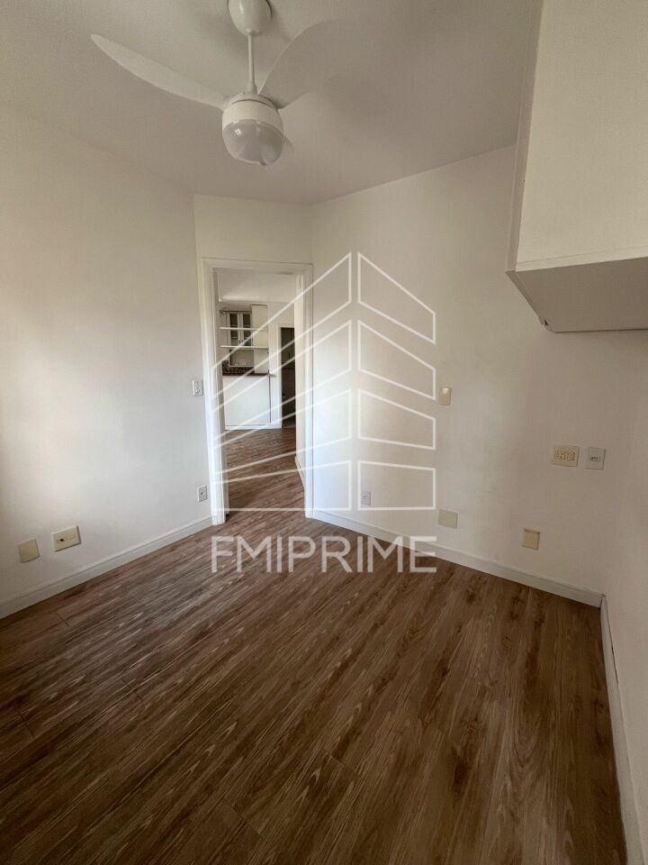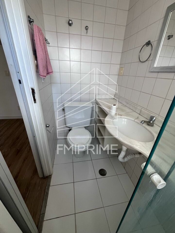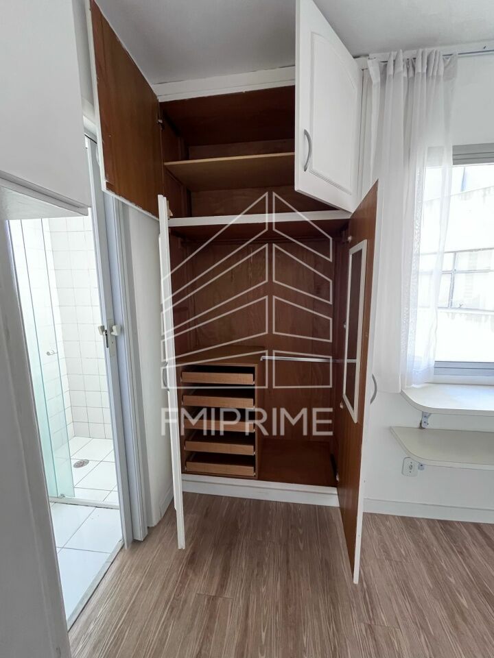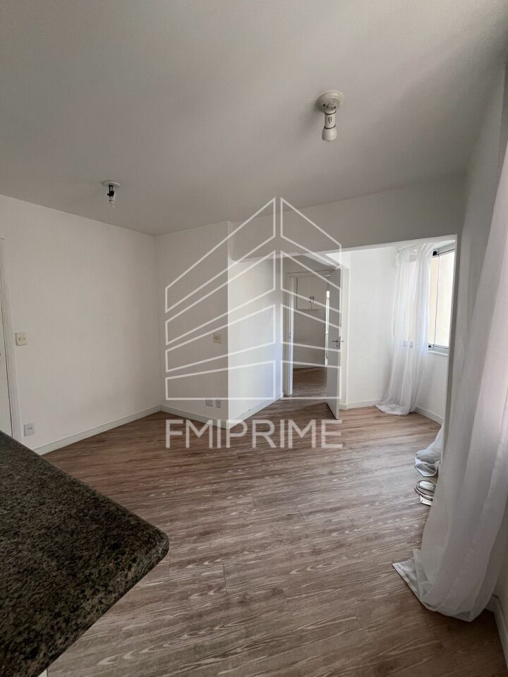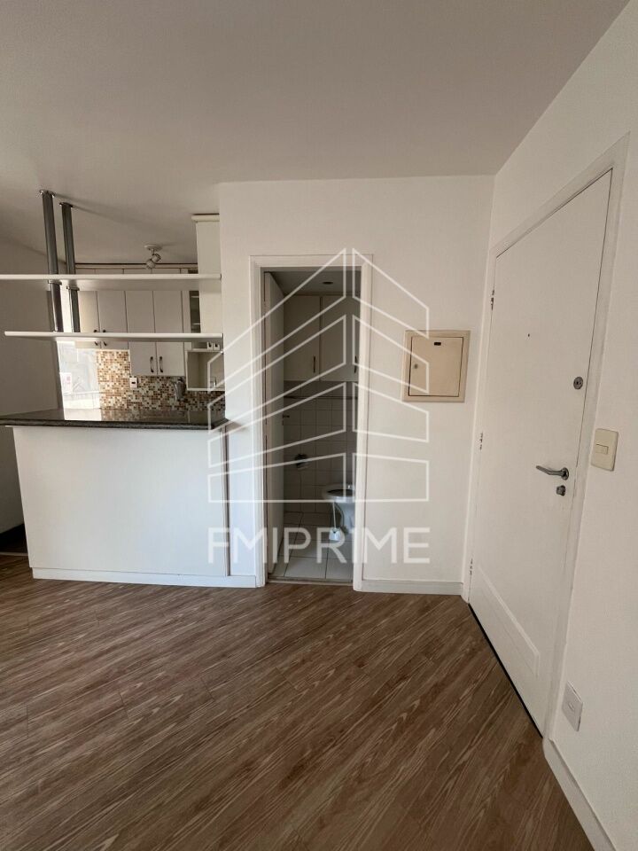 Apartamento de um quarto sendo suíte com armários, cozinha americana, lavabo, lavanderia, churrasqueira e áreas comuns.
