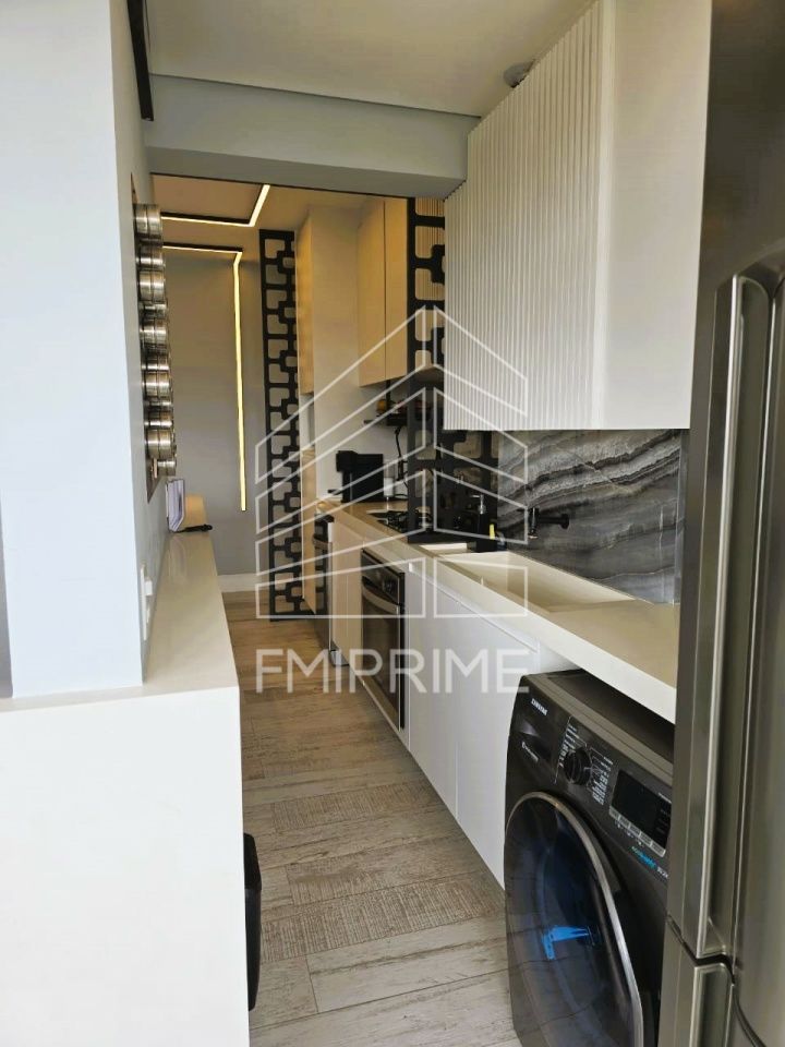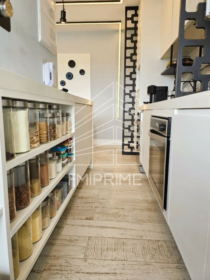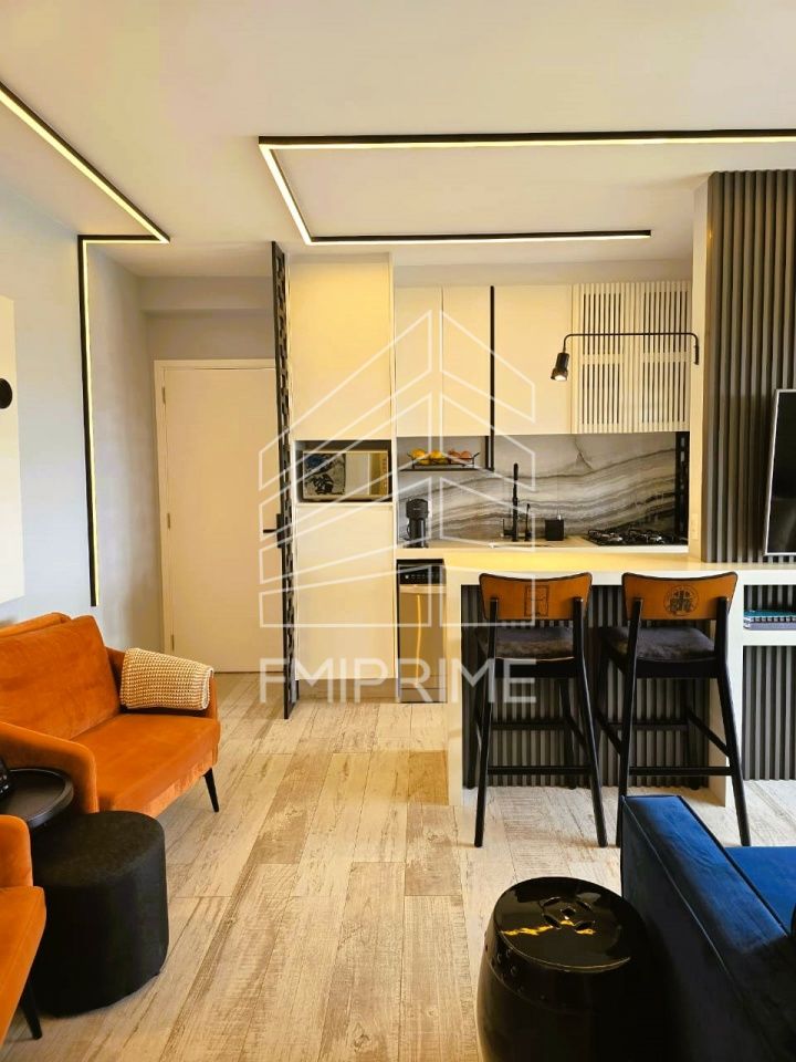 O apartamento possui 2 quartos, sendo um deles 1 suíte com banheiro que possui ventilação natural, e está completamente mobiliado com peças elegantes e funcionais, incluindo 2 poltronas, mesinhas laterais, banquetas, 1 sofá confortável, puffs de cerâmica, 1 mesa de jantar com cadeiras, 1 banco baú, além de uma cozinha equipada com coifa, cooktop, forno e máquina de lavar-louças.