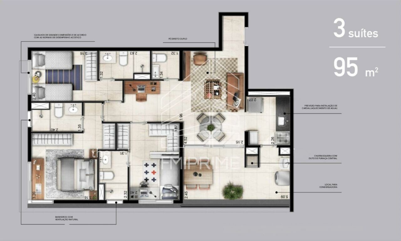 Com 94,75 m², o imóvel oferece três suítes, três banheiros, lavabo, churrasqueira privativa e duas vagas de garagem. Totalmente mobiliado e decorado, é comercializado no conceito porteira fechada, proporcionando uma transição imediata para quem busca um imóvel pronto, sem etapas adicionais de obra ou adequação.
