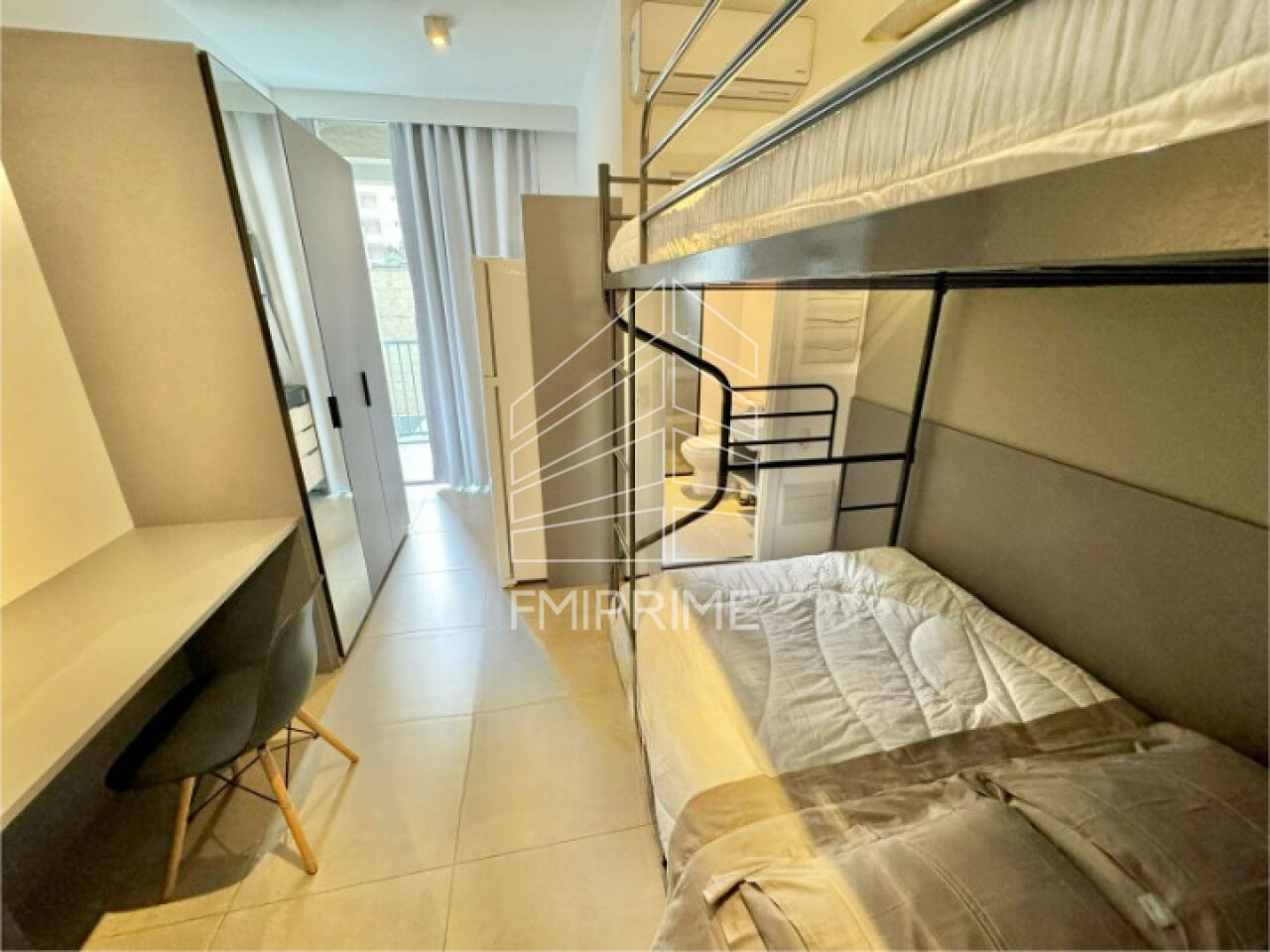 # Quarto: *Ar Condicionado*, *Cama*, Colchao casal, Conexão USB, Guarda-roupas com espelho, bancada com Cadeiras, Cortina Blackout