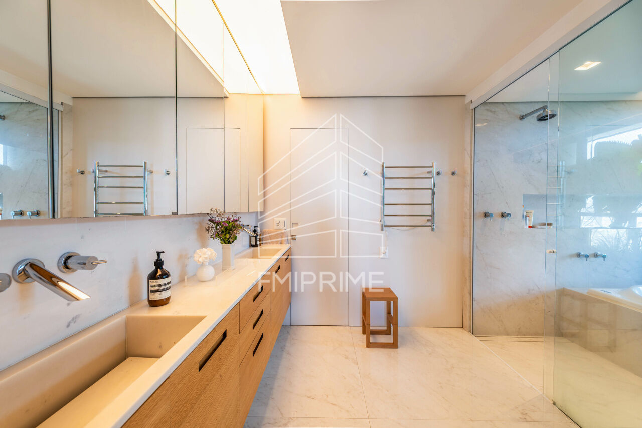 Na área íntima, os cinco dormitórios, sendo quatro suítes, garantem privacidade e amplitude, com destaque para a suíte master, que conta com closet walk-in e atmosfera de refúgio particular. O imóvel dispõe ainda de cinco vagas de garagem, atendendo com praticidade às demandas de um estilo de vida exigente.